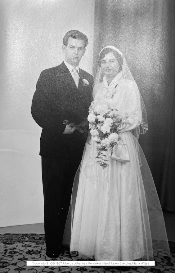 | Partner | Albertus Johannes Hendrikus HendriksAlbertus Johannes Hendrikus (Bertus) Hendriks ![]() * 05-02-1931 Havikerwaard Gem. Rheden † 19-10-2023 Arnhem ∞ Everdina Maria (Diny) Witjes, 21-08-1957 Giesbeek Gem. Angerlo |