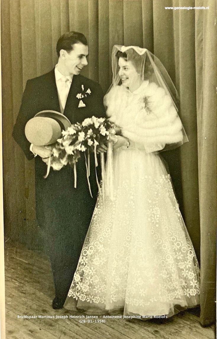 Notitie bij relatie met Antoinette Josephine Maria Roelofs Kerkelijk huwelijk Datum: 29-01-1958 Plaats: Velp Gem. Rheden Bron: Familie |