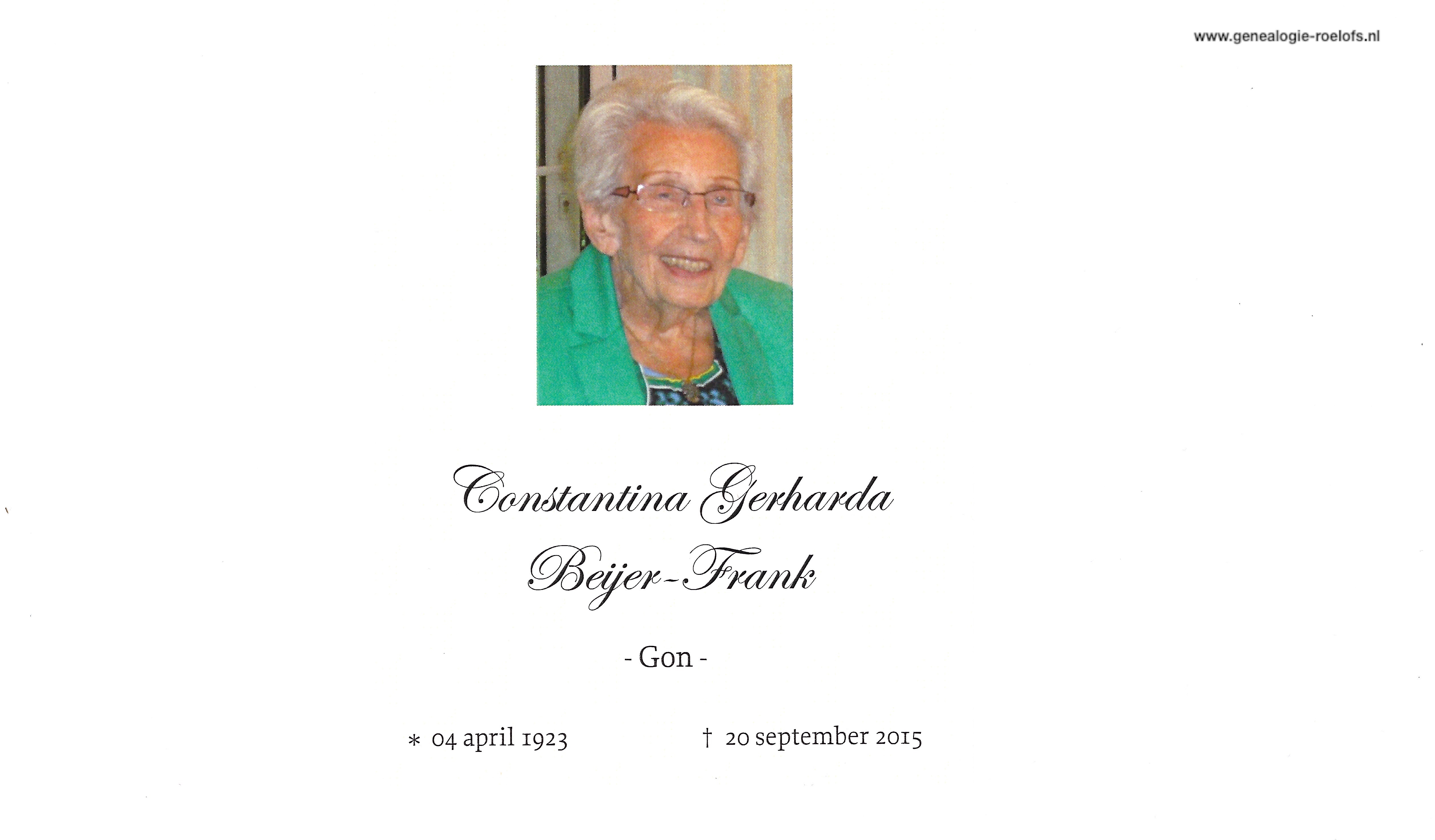 | Partner | Wilhelmus Johannes BeijerWilhelmus Johannes (Wim) Beijer ![]() * 23-12-1923 Doetinchem † 31-03-1989 Maarn ∞ Constantina Gerharda (Gon) Frank, 12-12-1950 Terborg, 2 kinderen |