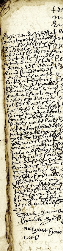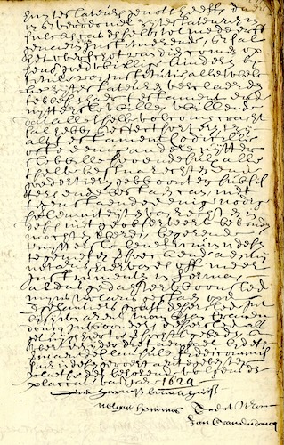 235 In de naam van de Heer, amen. Laat het voor iedereen duidelijk zijn door dit huidige openbare instrument, dat in het jaar van onze Heer en Zaligmaker Jezus Christus 1655, op de 28e dag van de maand september, omstreeks zeven uur ’s avonds, voor mij, Joannes Hellerus, openbaar notaris, erkend door het hof van Holland, residerend te Amsterdam, en de hieronder genoemde getuigen, persoonlijk zijn verschenen: Dirck Harmsz Brinckhuis, kleermaker, en zijn echtgenote Neeltje Hommes, beiden woonachtig in de Korsjespoortsteeg van deze stad, mij, notaris, bekend, en bij volle verstand, geheugen en spraak, zoals duidelijk bleek. Zij verklaarden door overweging van hun dood hun testament en uiterste wil te hebben gemaakt zoals volgt: Eerste bepaling: Hun ziel bevelen zij aan God Almachtig, en hun overleden lichaam aan de aarde. Vervolgens hebben zij hun enige en universele erfgenamen ingesteld, namelijk al hun kinderen, reeds geboren en nog te verwekken, zonder uitzondering. De langstlevende van hen zal gedurende zijn of haar leven of tot een nieuw huwelijk volledig bezit en eigendom behouden over alle roerende en onroerende goederen, vorderingen en rechten, achtergelaten door de eerststervende, met de bevoegdheid deze te beheren, benutten, verkopen, verhandelen, verteren, belasten of vervreemden naar eigen inzicht, zoals zij beiden dat tijdens hun leven zouden mogen doen. Dit met de voorwaarde dat de langstlevende hun minderjarige kinderen op een fatsoenlijke manier zal onderhouden en opvoeden, en hen zal voorzien van een passend aandeel bij het bereiken van de volwassen leeftijd of het aangaan van een huwelijk. Overige bepalingen: De kinderen zullen elk een som van 600 gulden ontvangen als deel van hun legitieme portie, in mindering gebracht op de nalatenschap van de eerststervende. Daarnaast worden hun zonen, Harmen Brinckhuis en Joannes Brinckhuis, afzonderlijk toegewezen wat zij ontvangen hebben als legitieme portie uit de goederen van de eerststervende. Er zal geen verplichte inbreng van goederen zijn tussen de kinderen, ongeacht of één kind meer heeft ontvangen dan een ander. De langstlevende ouder zal optreden als voogd over de minderjarige kinderen en hun goederen. Indien de langstlevende opnieuw trouwt, moet hij of zij de helft van de nalatenschap van de eerststervende aan de kinderen afstaan als hun wettige erfdeel, zonder dat de kinderen hoeven in te brengen wat zij reeds ontvangen hebben. Indien er na overlijden van de langstlevende nog gemeenschappelijke goederen overblijven, zullen deze onverdeeld blijven en worden gebruikt voor het onderhoud van de minderjarige kinderen totdat zij volwassen zijn of in het huwelijk treden. Eventuele resterende inkomsten worden jaarlijks toegevoegd aan het kapitaal. Slotbepalingen: Zij verklaren dit testament en uiterste wil te zijn, met de wens dat dit zijn volledige kracht behoudt als testament, codicil of laatste wil, ongeacht mogelijke juridische formaliteiten die niet in acht zijn genomen. Dit testament werd opgesteld in mijn notariskantoor, in aanwezigheid van de getuigen Arent Minu en Jan Cranendouck, inwoners van deze stad, die hiertoe werden verzocht en gebeden. De clausule betreffende fideicommissen werd hierbij in overeenstemming met het plakkaat van het jaar 1624 verklaard. Ondertekend: Dirck Harmsz Brinckhuis Neeltje Hommes Arent Minu Jan Cranendouck Aantekening in de kantlijn. Willende dat allen, inclusief de hierboven genoemde erfgenamen, die van huizen afstammen, zullen komen erven, zullen erven en opgesteld worden zoals bepaald door het ene kind, zonder daarbij een einde te maken aan de afstammingslijn. Verder wordt bepaald dat van de ene erfgenaam op de andere zal worden overgedragen tot het allerlaatste einde. Dit alles volgens de vastgestelde testamentaire bepalingen, zonder afwijkingen of tegenstrijdigheden. Deze bepalingen zullen gelden voor het geheel van de erfenis, zoals vastgesteld bij hun overlijden. Bij gebrek aan kinderen die tegenstrijdige instructies hebben achtergelaten, zal alles conform de codicillen worden uitgevoerd. Gemaakt en ondertekend zoals vastgesteld op de genoemde datum.” |