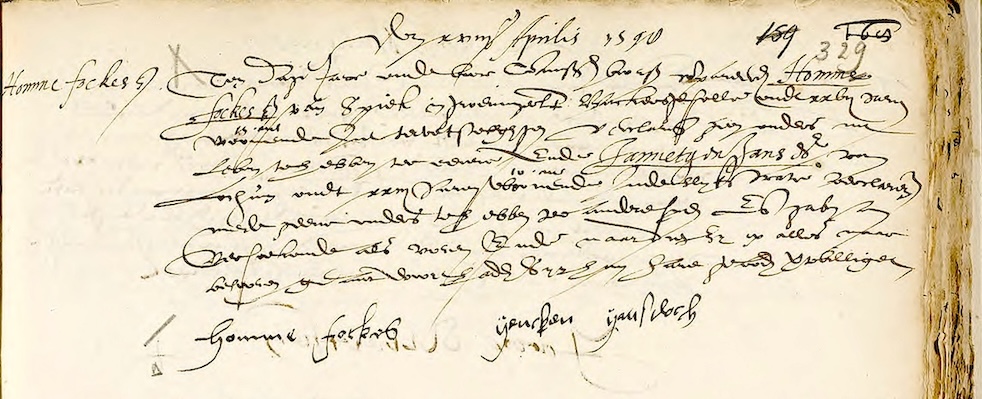 Op 18 april 1598 zijn in Amsterdam in ondertrouw gegaan: Bruidegom: Homme Fockesz, afkomstig uit Friesland, 25 jaar oud, varensgezel, wonende in de Sint Anthoniesbreestraat. Zijn ouders zijn overleden; hij werd geassisteerd door zijn neef, Jan Fockesz. Bruid: Jannetjen Jans, afkomstig uit Amsterdam, 22 jaar oud, wonende in de Sint Anthoniesbreestraat. Haar ouders zijn eveneens overleden; zij werd geassisteerd door haar nicht, Trijntje Cornelis. Na de gebruikelijke aankondigingen zijn zij op 3 mei 1598 in de Oude Kerk te Amsterdam in het huwelijk getreden. Deze gegevens zijn afkomstig uit de ondertrouwregisters van Amsterdam, die informatie bevatten over huwelijken in de periode 1565-1811. G.A. Amsterdam OT reg. 1596-1599, inv. nr. 408, blad p.329 |