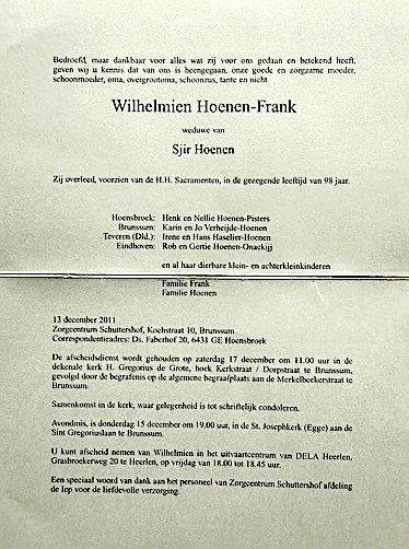 Wilhelmina Johanna Frank overlijden