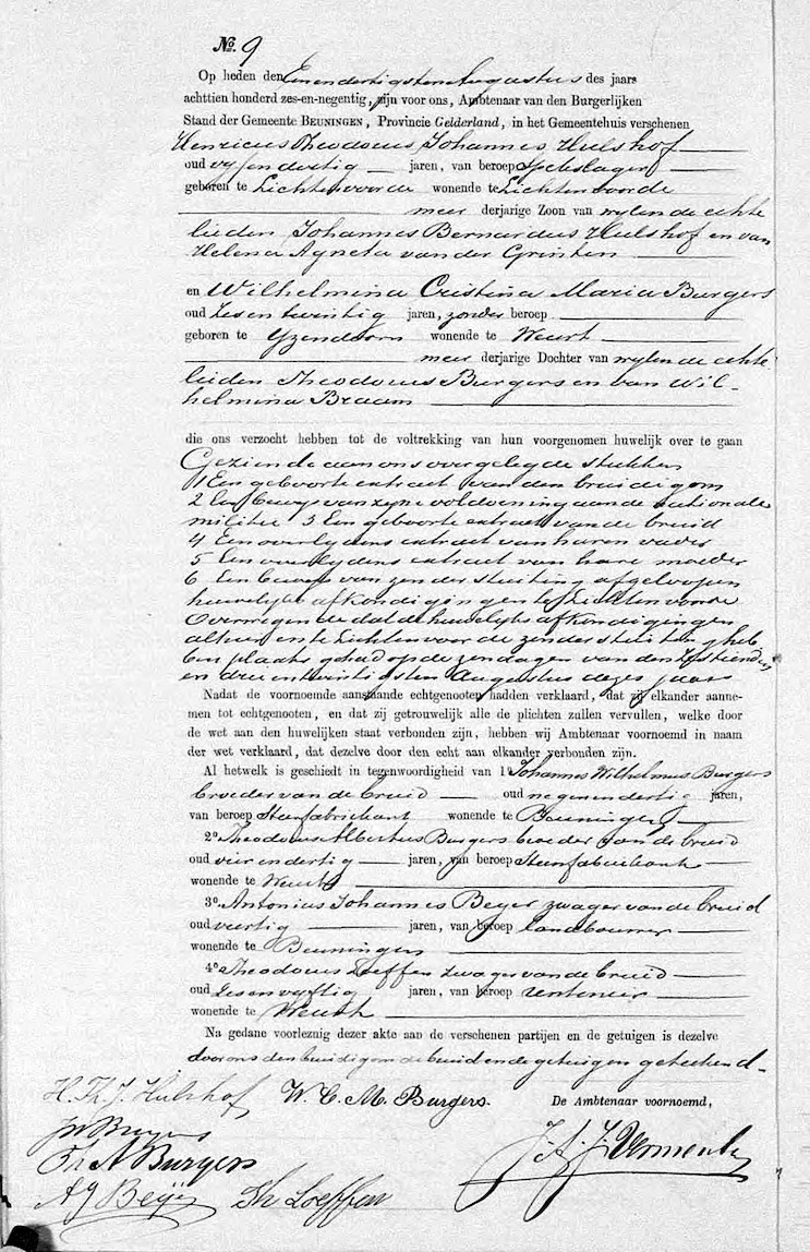 Beuningen huw. 31-08-1896 Henricus Theodorus Johannes Hulshof en Wilhelmina Christina Maria Burgers