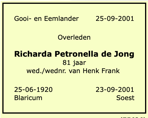 Richarda Petronella de Jong overlijden