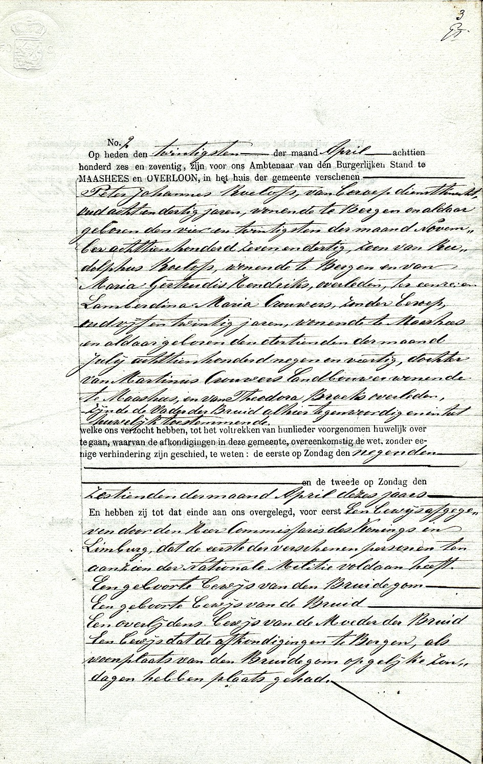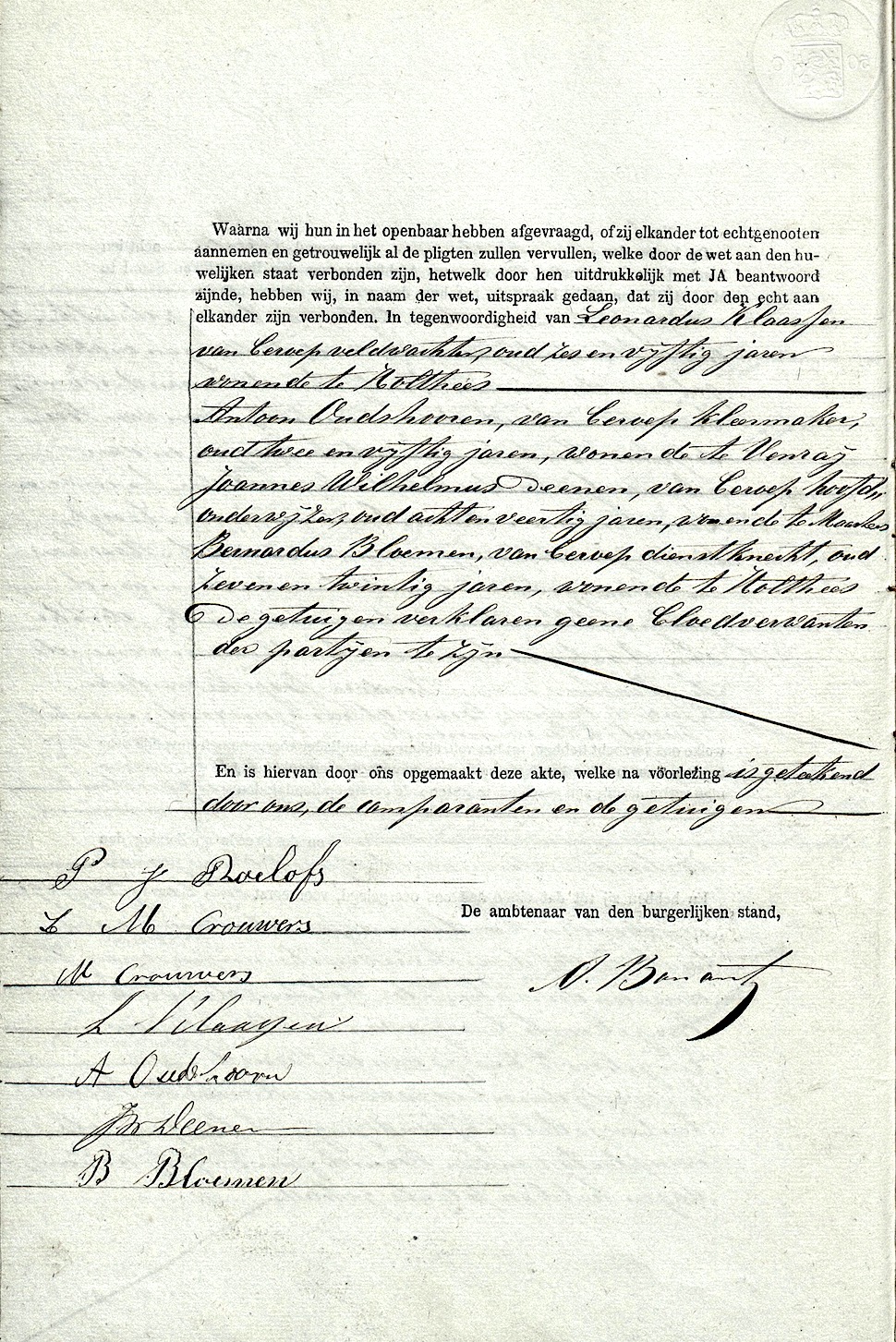 Maashees en Overloon huw. 20-04-1876 Peter Johannes Roelofs en Lamberdina Maria Crouwers