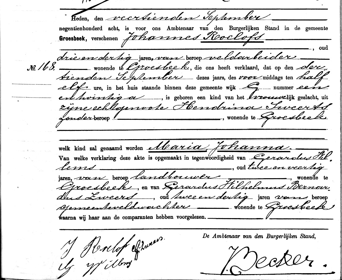 GeldA, geb. reg. Groesbeek 1909, akte 168