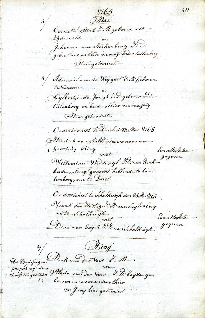RAR, DTB Culemborg R.K. trouwb. 1651-1791, inv.nr. 68 blz. 411
