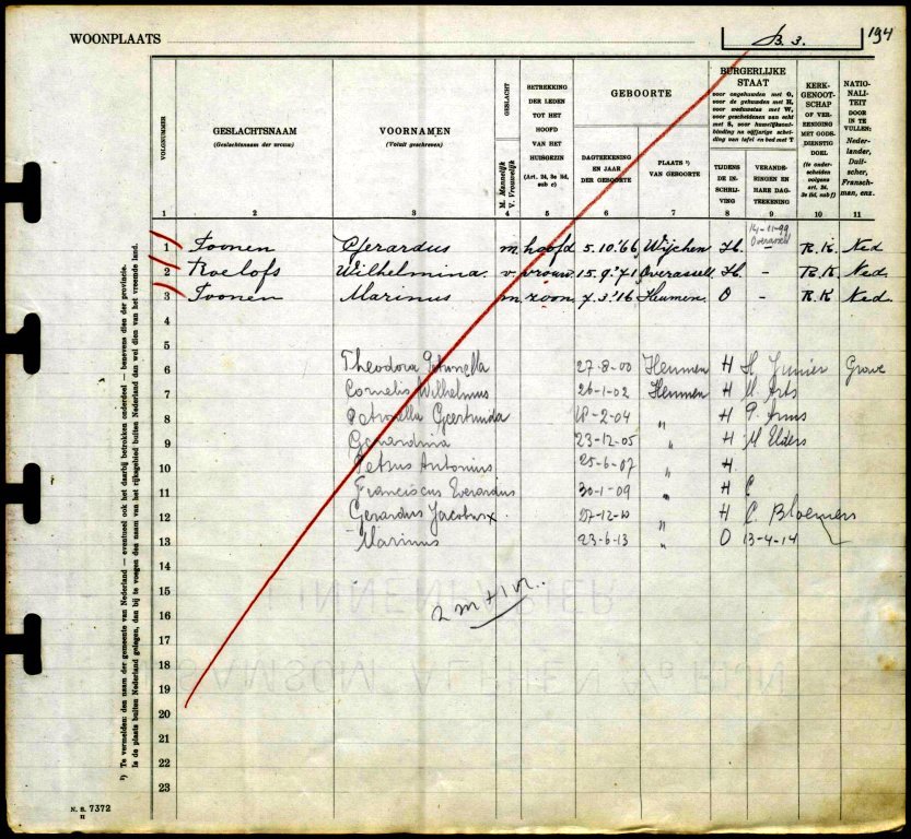 Gezinskaart Gerardus Toonen en Wilhelmina Roelofs