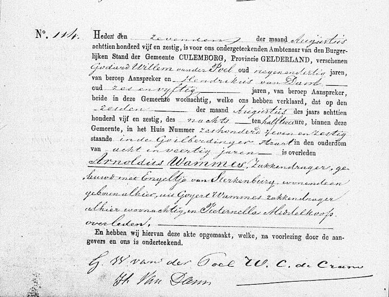 BS Overlijden met Arnoldus Wammes Overledene: Arnoldus Wammes Beroep: zakkendrager Geslacht: Man Leeftijd: 48 Jaar Vader: Goijert Wammes Beroep: zakkendrager Moeder: Pieternella Middelkoop Beroep: geen beroep vermeld Partner: Engeltje Sterkenburg Gebeurtenis: Overlijden Datum: 06-08-1865 Gebeurtenisplaats: Culemborg Documenttype: BS Overlijden Erfgoedinstelling: Gelders Archief Plaats instelling: Arnhem Collectiegebied: Gelderland Archief: 0207 Registratienummer: 5837 Aktenummer: 114 Registratiedatum: 07-08-1865 Akteplaats ; Culemborg |