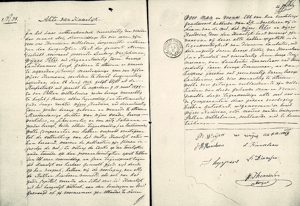 Fam. search, huw. reg. Ottersum 1834, akte 38