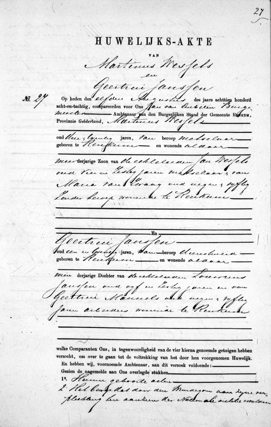 Renkum huw. 11-08-1888 Martinus Wessels en Geertrui Janssen