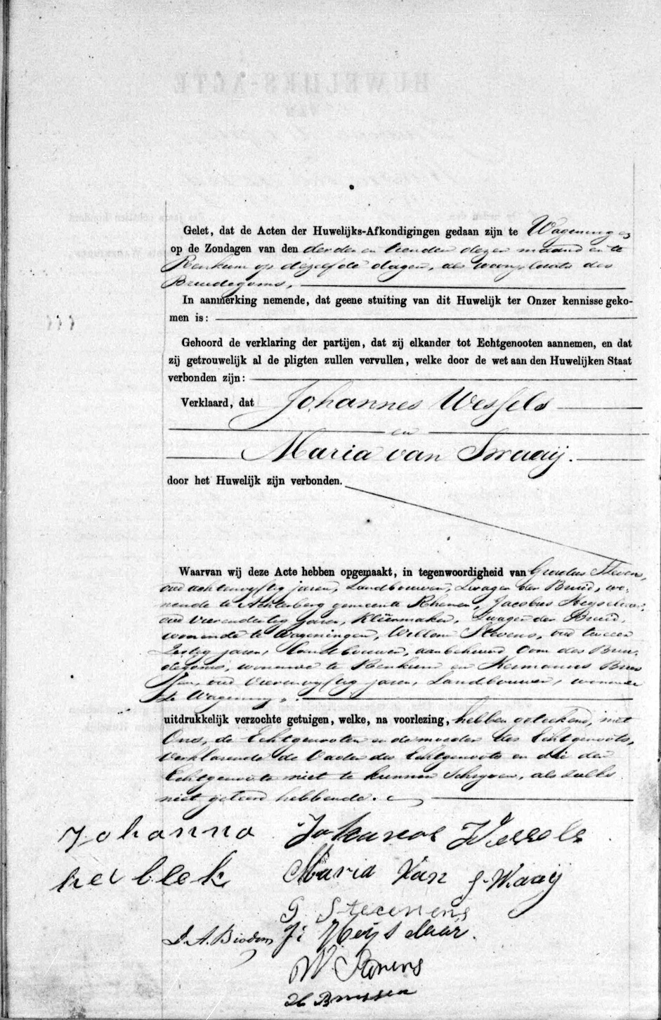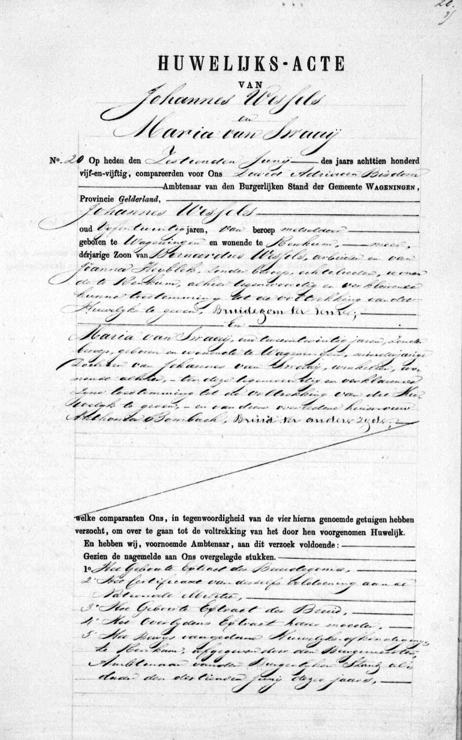 Wageningen huw. 16-06-1855 Johannes Wessels en Maria van Swaaij