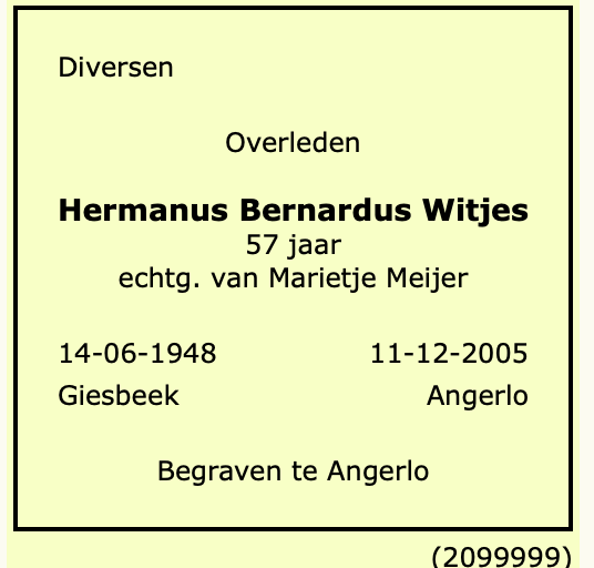 Hermanus Bernardus Witjes overlijden