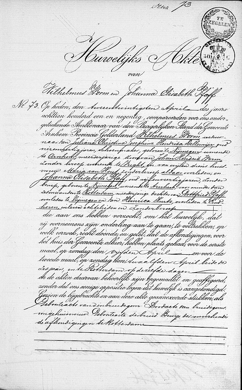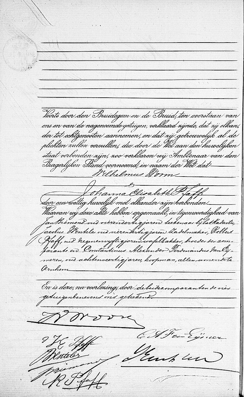 Arnhem huw. 22-04-1891 Wilhelmus Worm en Johanna Elisabeth Pfaff
