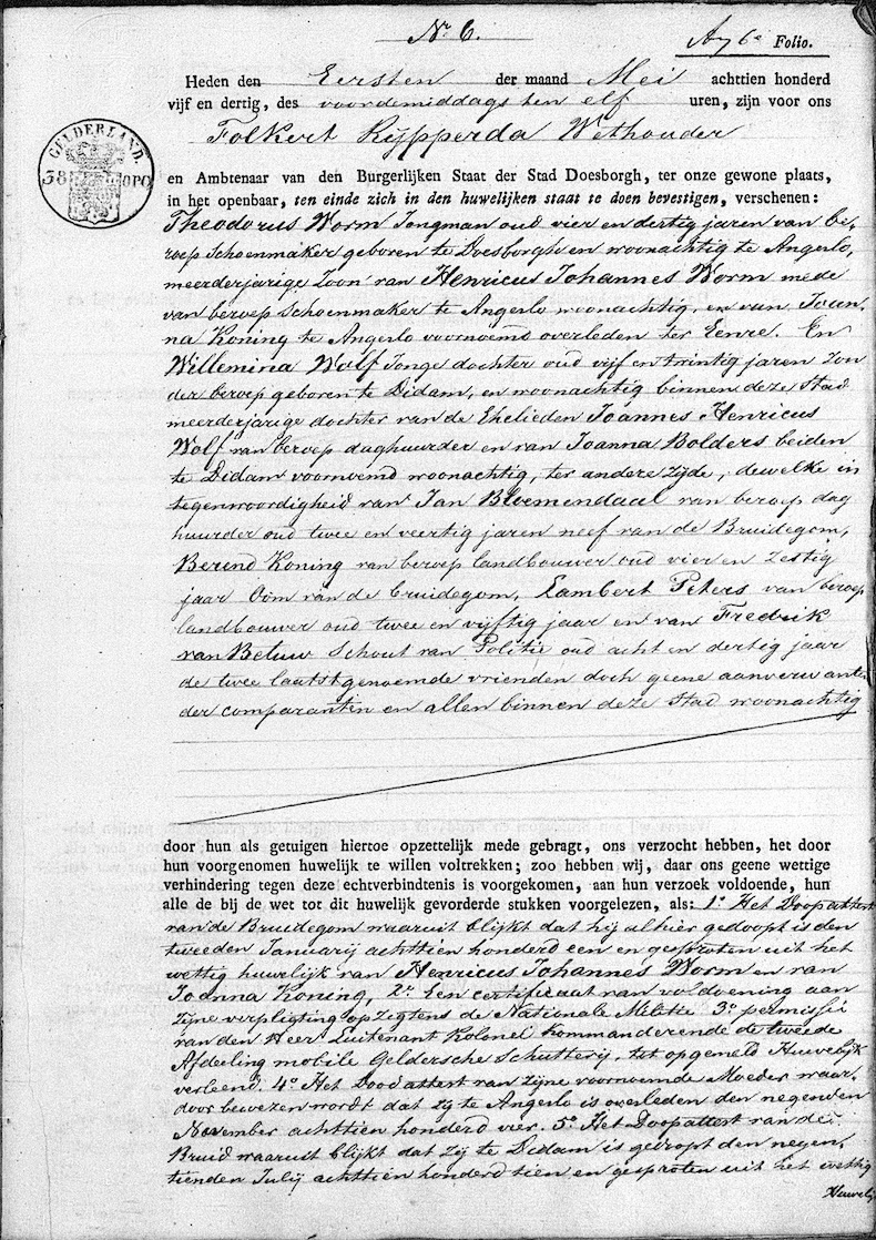 Doesburg huw. 01-05-1835 .Theodorus Worm en Willemina Wolf.