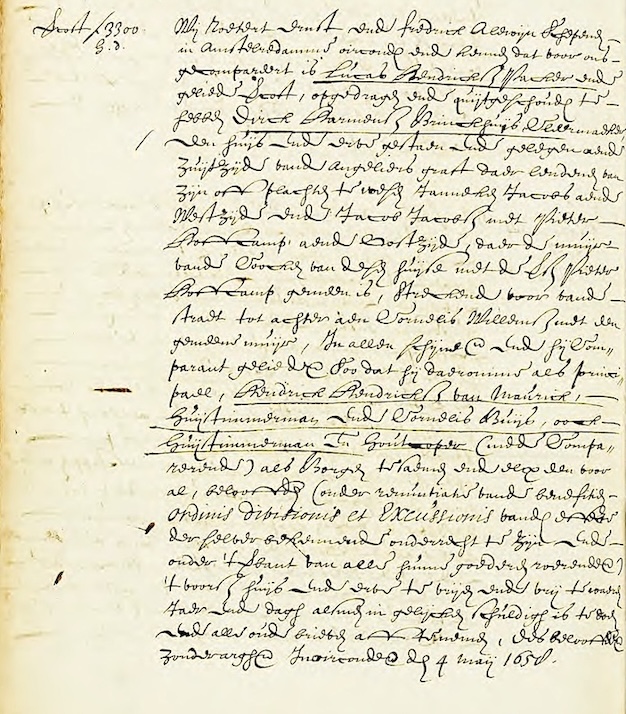 Verkocht voor ƒ 3300 G. d. Wij, Roelert Ernst en Frederik Alewijn, schepenen in Amsterdam, verklaren en maken bekend dat voor ons is verschenen Lucas Hendricksz Packer, die verklaarde verkocht, overgedragen en vrijgegeven te hebben aan Dirck Harmensz Brinckhuijs, kleermaker, een huis en erf, staande en gelegen aan de zuidzijde van de Anjeliersgracht. De grenzen van dit perceel zijn als volgt: • Aan de westzijde gelegen naast Janneken Jacobs. • Aan de oostzijde naast Jacob Jacobsz en Pieter Boffcamp, waarbij de muur van de keuken van dit huis gemeenschappelijk is met de genoemde Pieter Boffcamp. • Het strekt zich uit van de straat tot achteraan aan het perceel van Cornelis Willemsz, met een gemeenschappelijke muur. De genoemde partijen, inclusief Lucas Hendricksz Packer als principaal, alsook Hendrick Hendricksz van Maurick, huistimmerman, en Cornelis Buijs, eveneens huistimmerman en houtkoper (eveneens aanwezig), beloven gezamenlijk en ieder afzonderlijk, onder afstand van de voordelen van de wetten van verdeling en uitstel, alsmede de effecten daarvan, en onder pandstelling van al hun roerende en onroerende goederen, het genoemde huis en erf vrij en onbezwaard over te dragen. Zij verplichten zich ook om binnen een jaar en een dag alle oude brieven en documenten op te halen en over te dragen, zoals gebruikelijk is. Deze belofte wordt zonder enig voorbehoud gedaan. Ter bevestiging hiervan, opgemaakt op 4 mei 1658. |