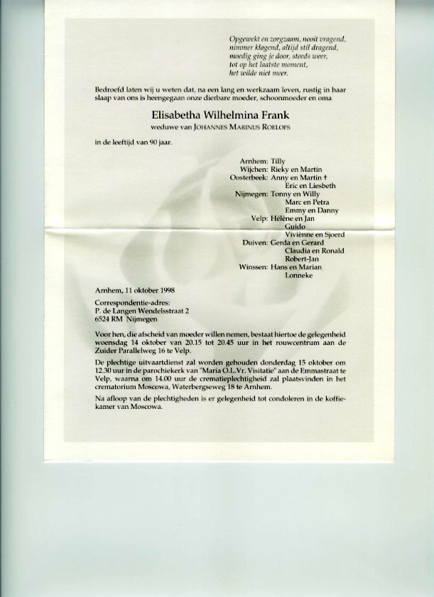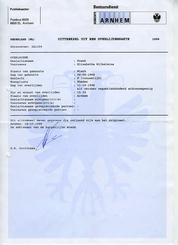 Elisabetha Wilhelmina Frank overlijden