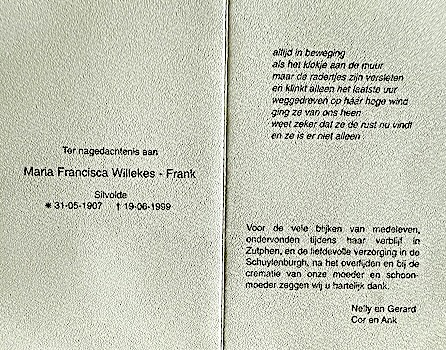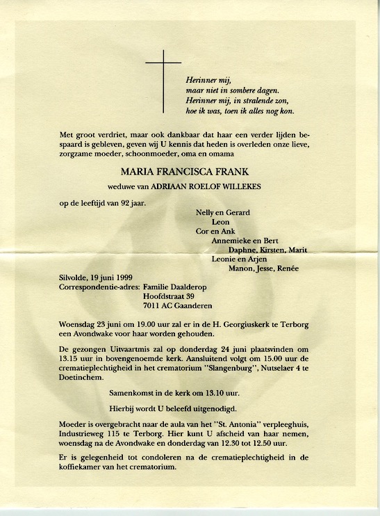 Maria Francisca Frank overlijden