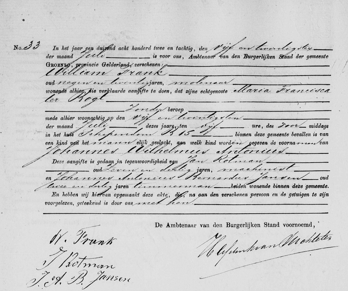 Johannes Wilhelmus Antonius Frank geboorte