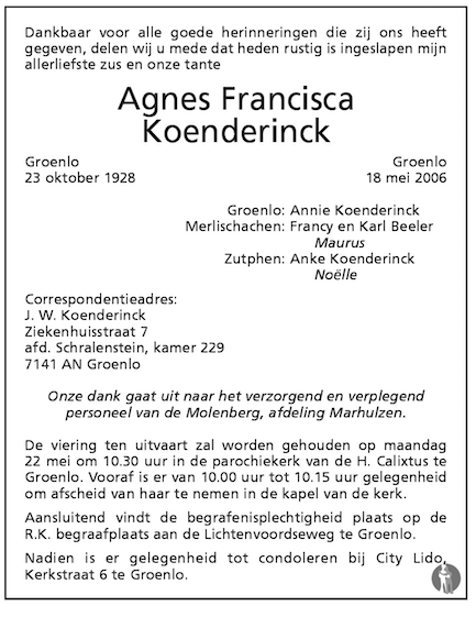 Agnes Francisca Koenderinck overlijden