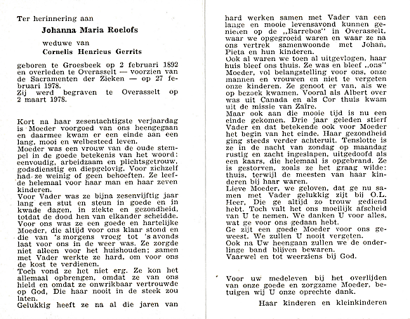 Johanna Maria Roelofs overlijden