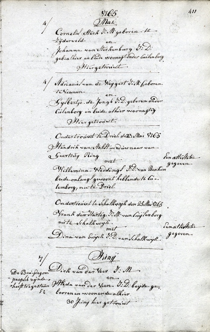 RAR, DTB Culemborg R.K. trouwb. 1651-1791, inv.nr. 68 blz. 411