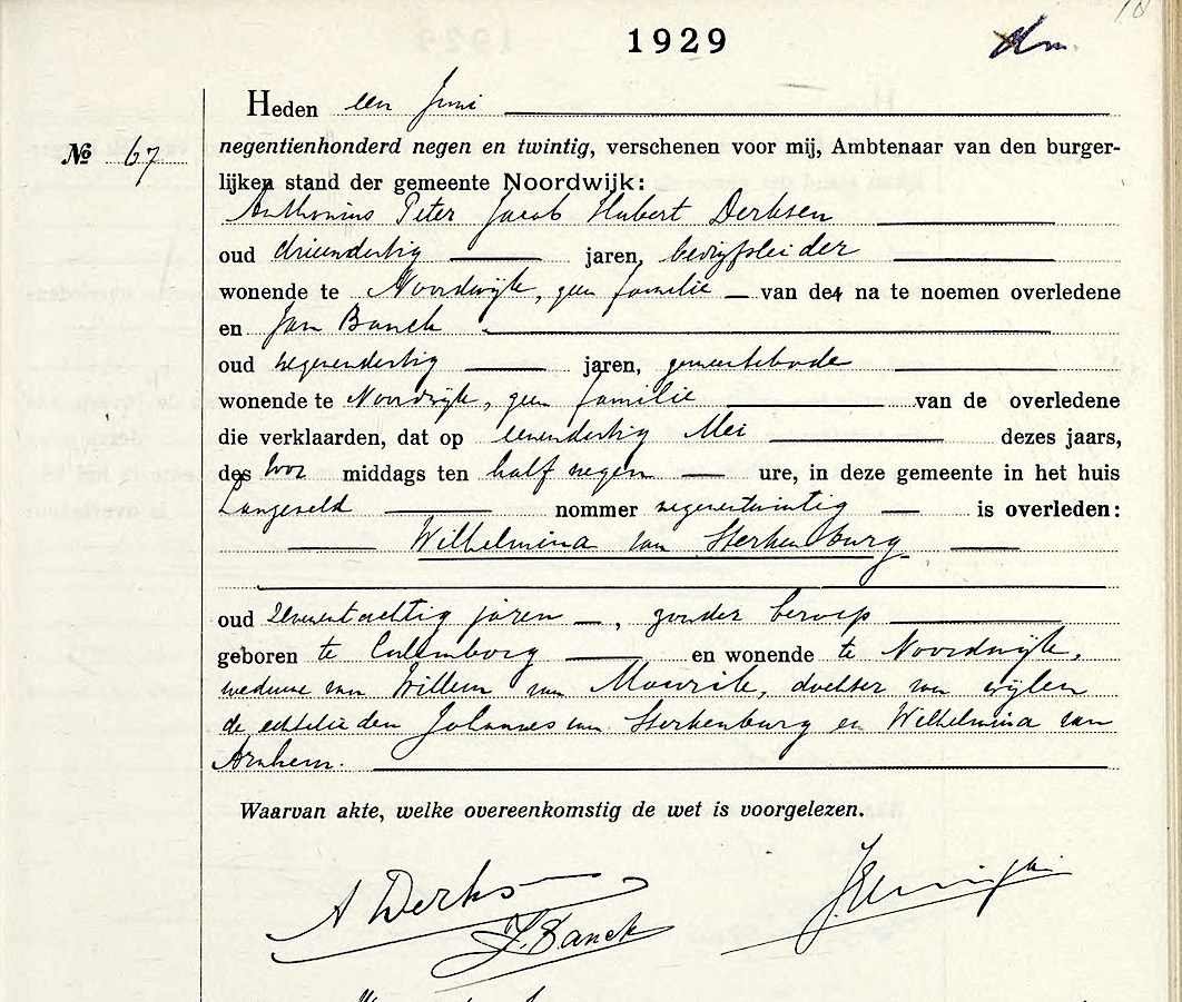 Erfgoed Leiden en Omstreken, overl. reg. Noordwijk 1929, akte 67