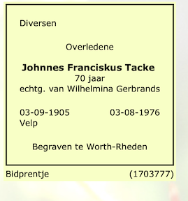 Johannes Franciscus Tacke overlijden