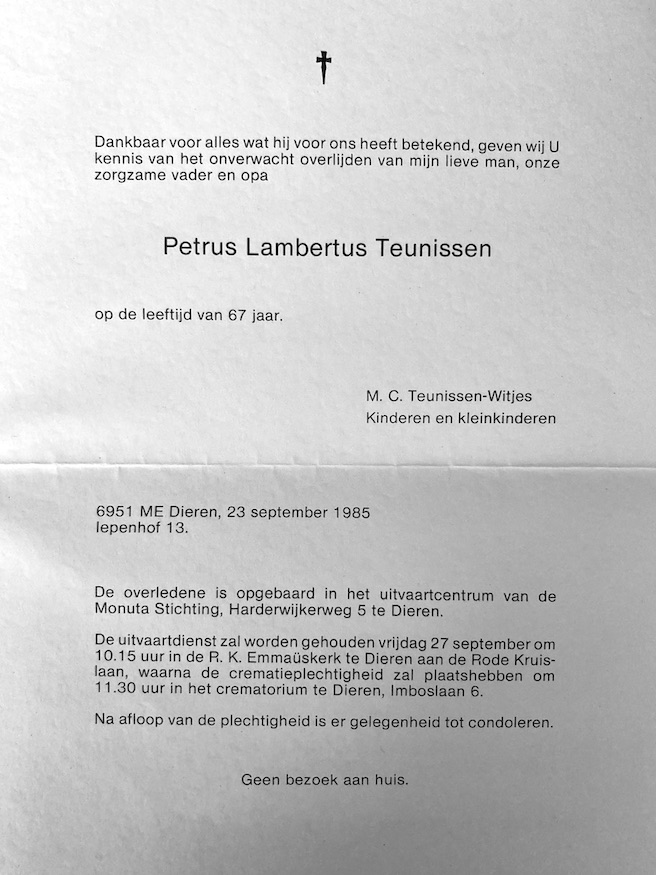 Petrus Lambertus Teunissen overlijden