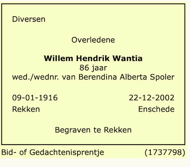 Willem Hendrik Wantia overlijden
