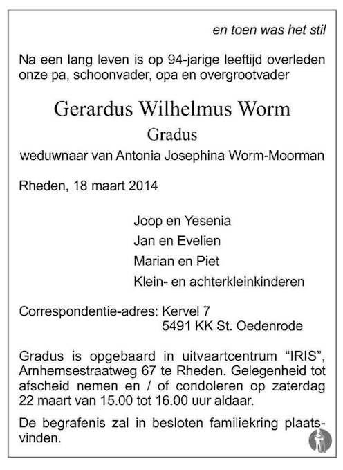 Gerardus Wilhelmus Worm overlijden