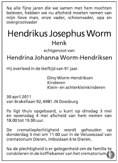 Hendrikus Josephus Worm overlijden